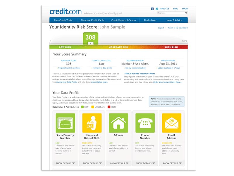 Identity Risk Dashboard: Credit.com (concepting + design)